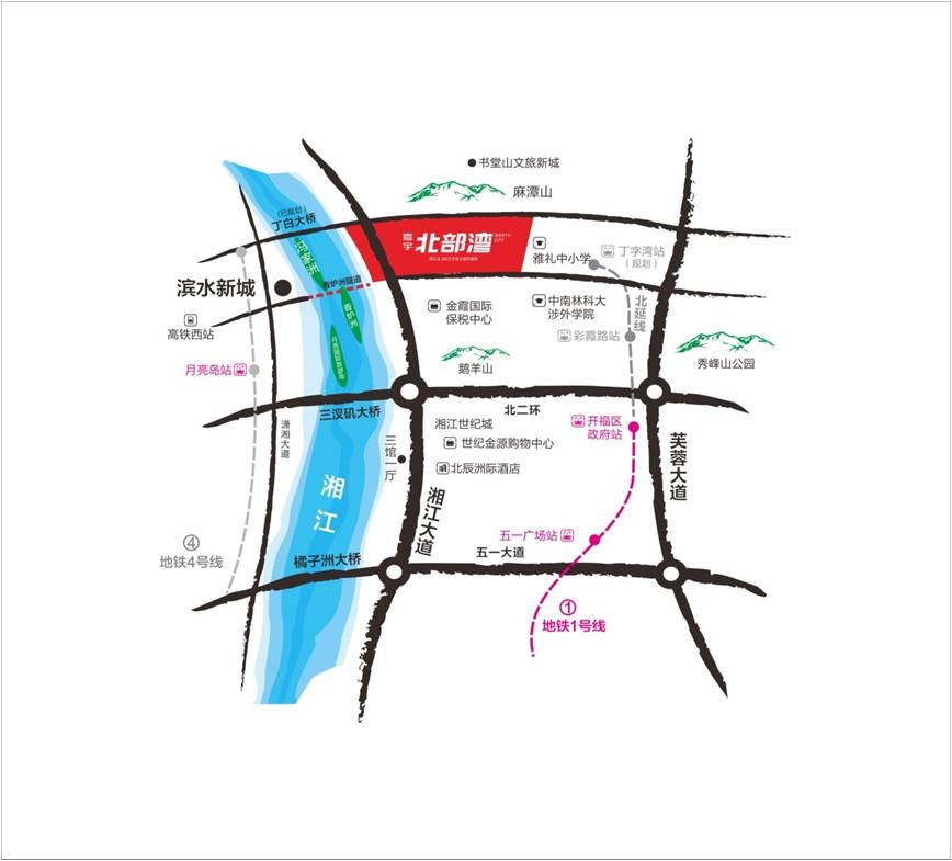 嘉宇·北部湾毗邻地铁1号线北延长线丁字镇站,现北延长线建设方案已通过审批,开工在即。若驱车行驶,通过湘江丁白桥(规划)、香炉洲过江隧道(规划),5分钟过江汇入滨水新城核心,10分钟即可抵达高铁西站新城;往北25分钟即可抵达以铜官窑为代表的长沙最大古镇旅游群。