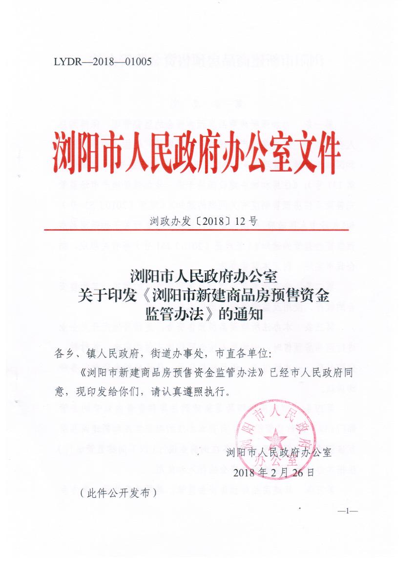 2018年2月26日,浏阳市出台《浏阳市新建商品房预售资金监管办法》,明确规定即日起,全市所有房地产企业应当在申请商品房预售许可证前,与监管机构、监管银行签订《浏阳市商品房预售资金监管协议书》,监管机构应当建立监管信息系统,对新建商品房预售资金进行监管。(商品房预售资金:指房地产开发企业进行商品房预售,由购房人按合同约定支付的定金、首付款、分期付款、一次性付款、银行按揭贷款、住房公积金贷款等各种购房款。)